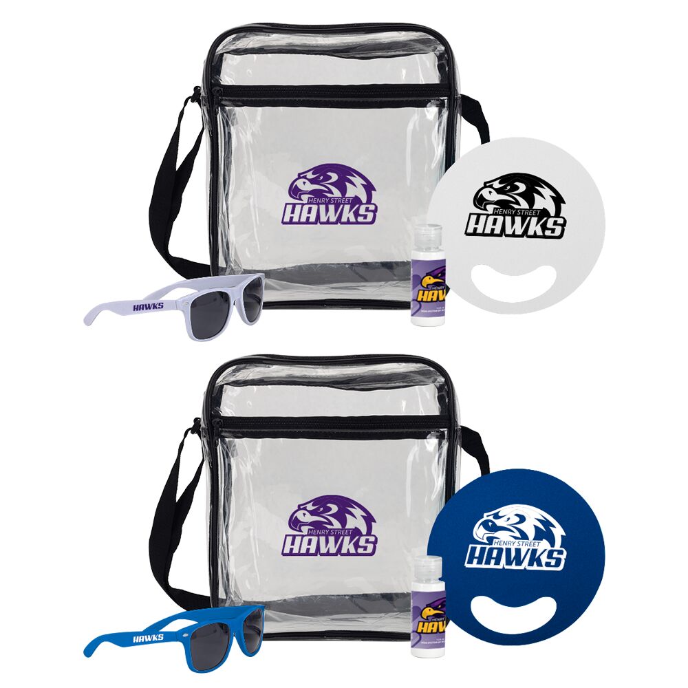 The Go Team Gift Set is going to be a fan favorite! This set is built for festivals, stadiums, and sunny-day events. Front and center is a clear stadium tote (TB20711) made from durable PVC, with a zippered front pocket and adjustable strap for grab-and-go convenience. Bonus: it meets standard NFL and NBS size requirements, so security checkpoints are a breeze. Inside, you'll find a circle hand fan (CS404) made from sturdy PP material in bright, eye-catching colors—it's perfect for waving your team spirit high (and staying cool while you do it). We've also packed in a 2 oz. bottle of SPF 30 sunscreen (ZYSUN) in a sleek clear cylinder to keep skin safe under the sun. And no fan kit is complete without shades (SG24101)! Our lightweight RPET sunglasses feature UV400 lenses for serious eye protection with a sustainable twist. Whether you're tailgating, cheering from the stands, or soaking up some weekend sun, this all-in-one set brings the hype!