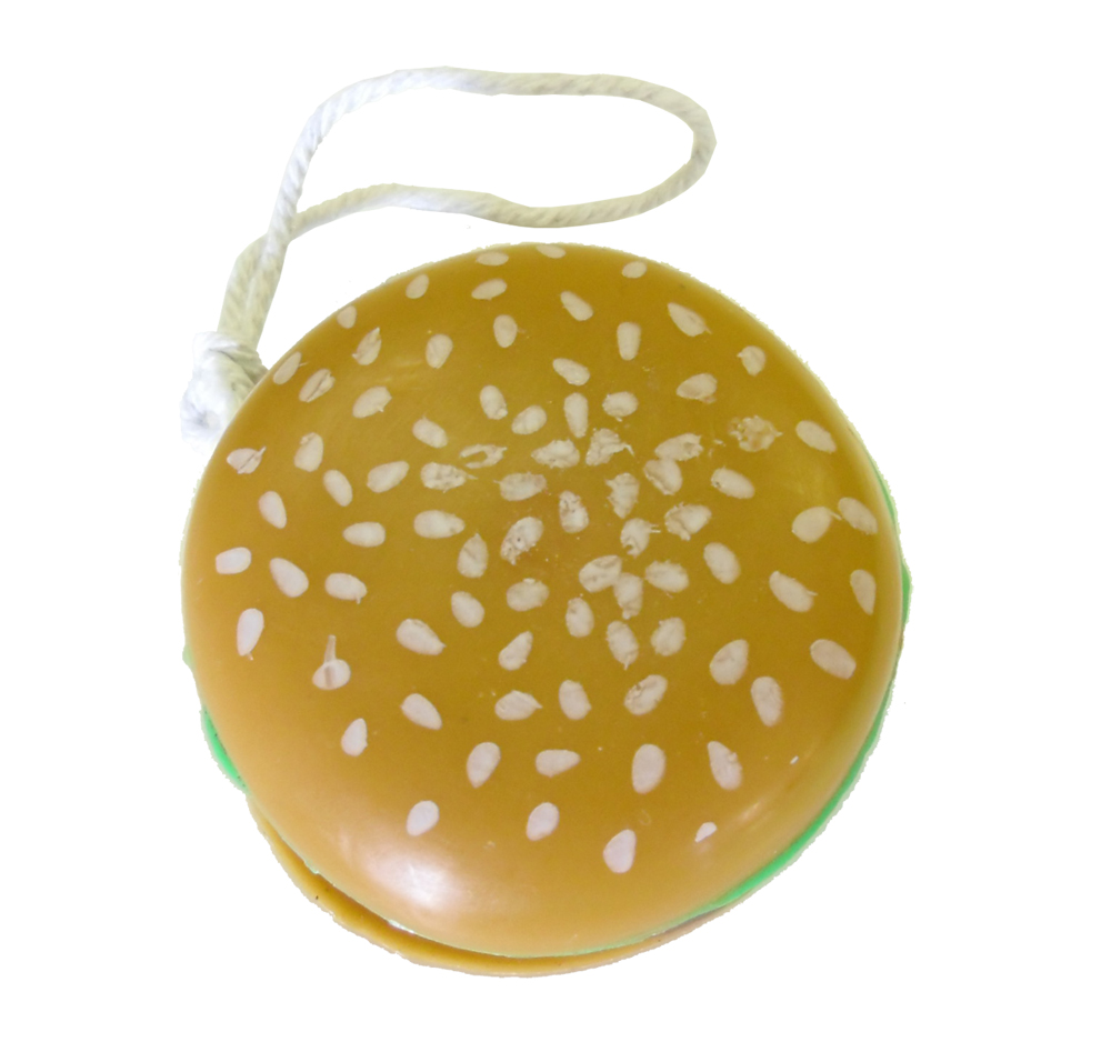 Hamburger shaped yo-yo. Made from lightweight impact resistant plastic with a attractive hamburger design. Perfect for promotions for fast food, children, party favors, Bar Mitzvah's and other events. The diameter of this yoyo is approximately 2". Well balanced yoyo for a smooth up and down action.